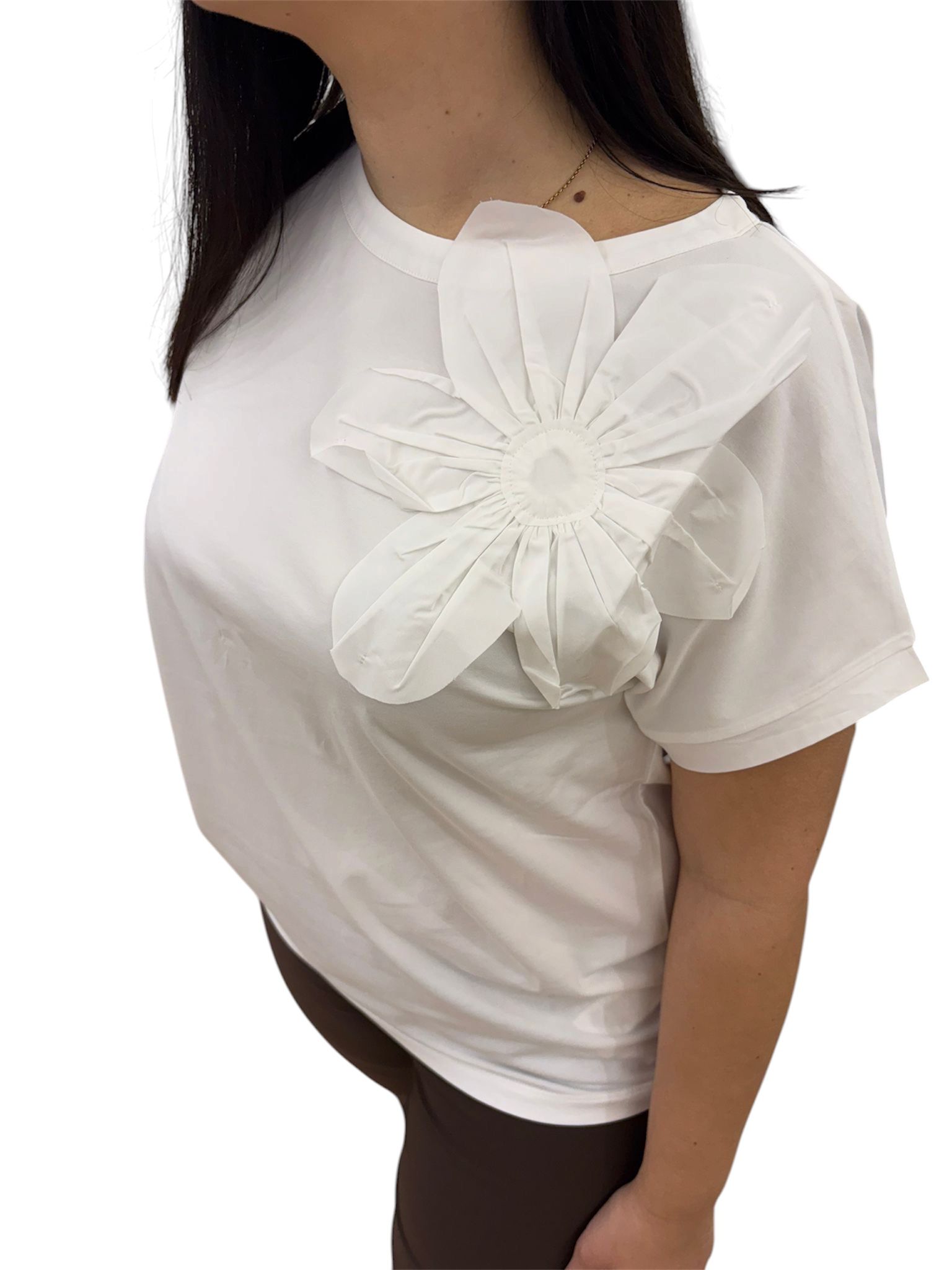 Scopri la shirt Corte dei Gonzaga, realizzata in morbido cotone, fresca e traspirante, perfetta per accompagnarti con stile durante tutta la giornata. Il suo delicato colore bianco dona luminosità e versatilità, mentre il dettaglio della rosa in tessuto in rilievo aggiunge un tocco romantico e ricercato.