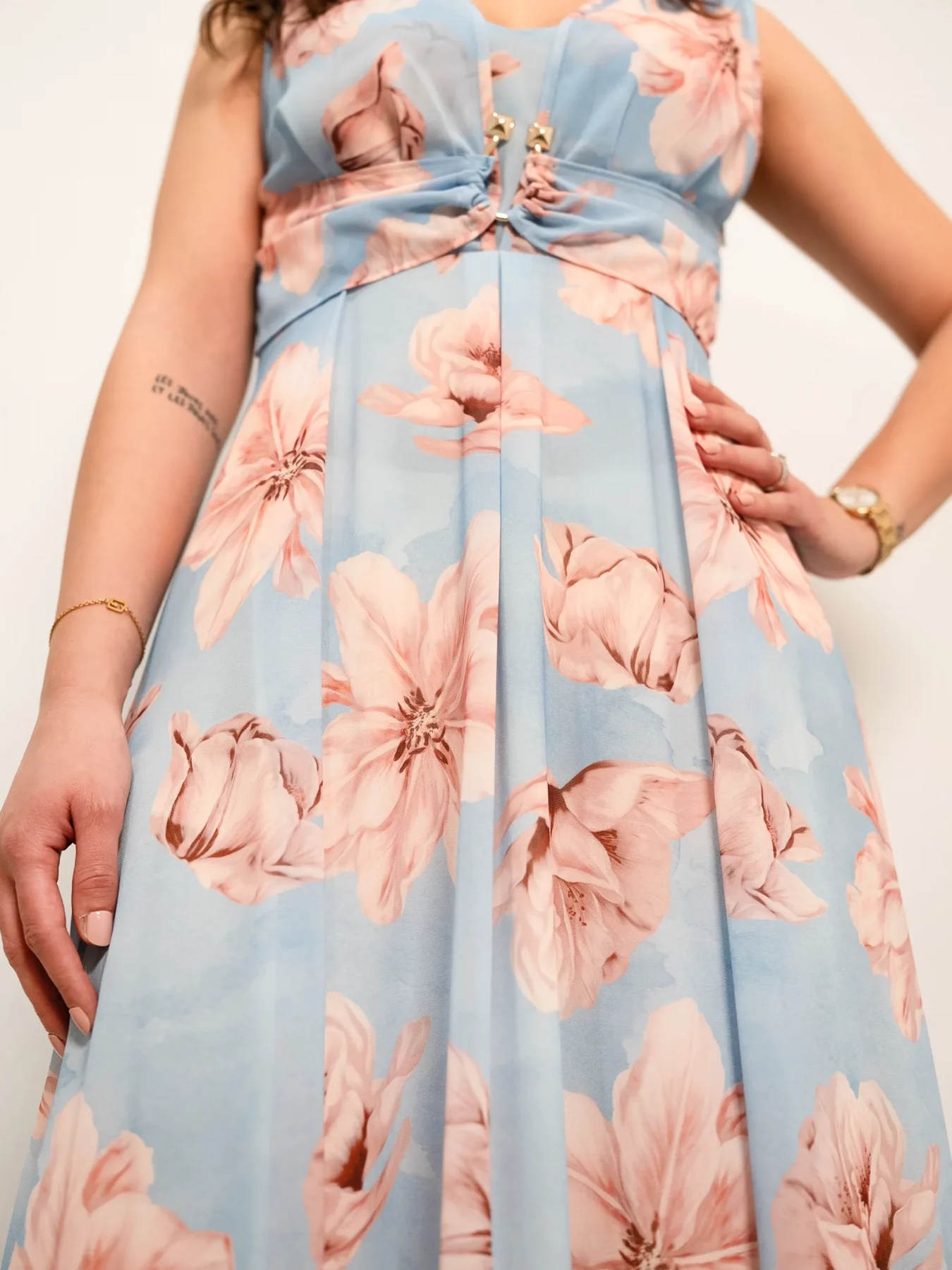 Il dettaglio in oro, applicato con maestria, impreziosisce il design, conferendo una luce sottile ma raffinata, perfetta per occasioni speciali. Ideale per serate estive, eventi formali o cerimonie, questo abito rappresenta l’armonia perfetta tra classe, comfort e stile.