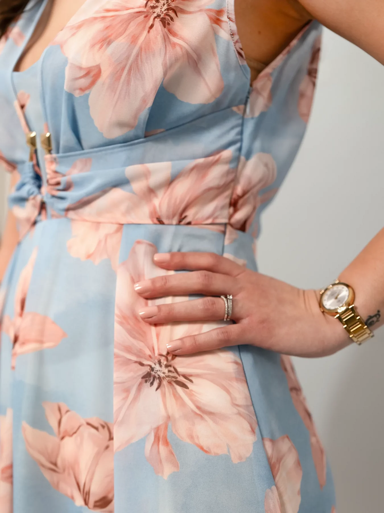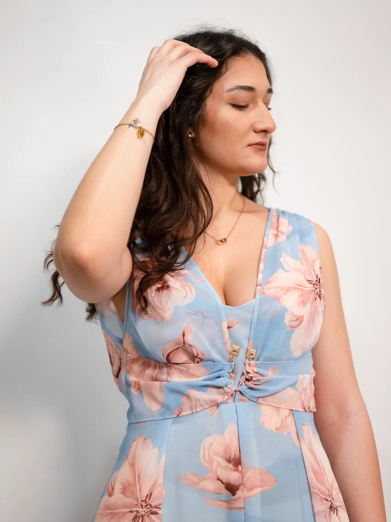 Scopri l’eleganza senza tempo con l’abito lungo della collezione Primavera/Estate di CORTE DEI GONZAGA. Questo vestito, realizzato in un delicato azzurro Japan, presenta una raffinata fantasia floreale che evoca la bellezza dei giardini in fiore. Il taglio lungo, con scollo a V, valorizza la figura in modo elegante e sofisticato, mentre la fascia sotto il seno aggiunge un tocco di femminilità e definizione alla silhouette.