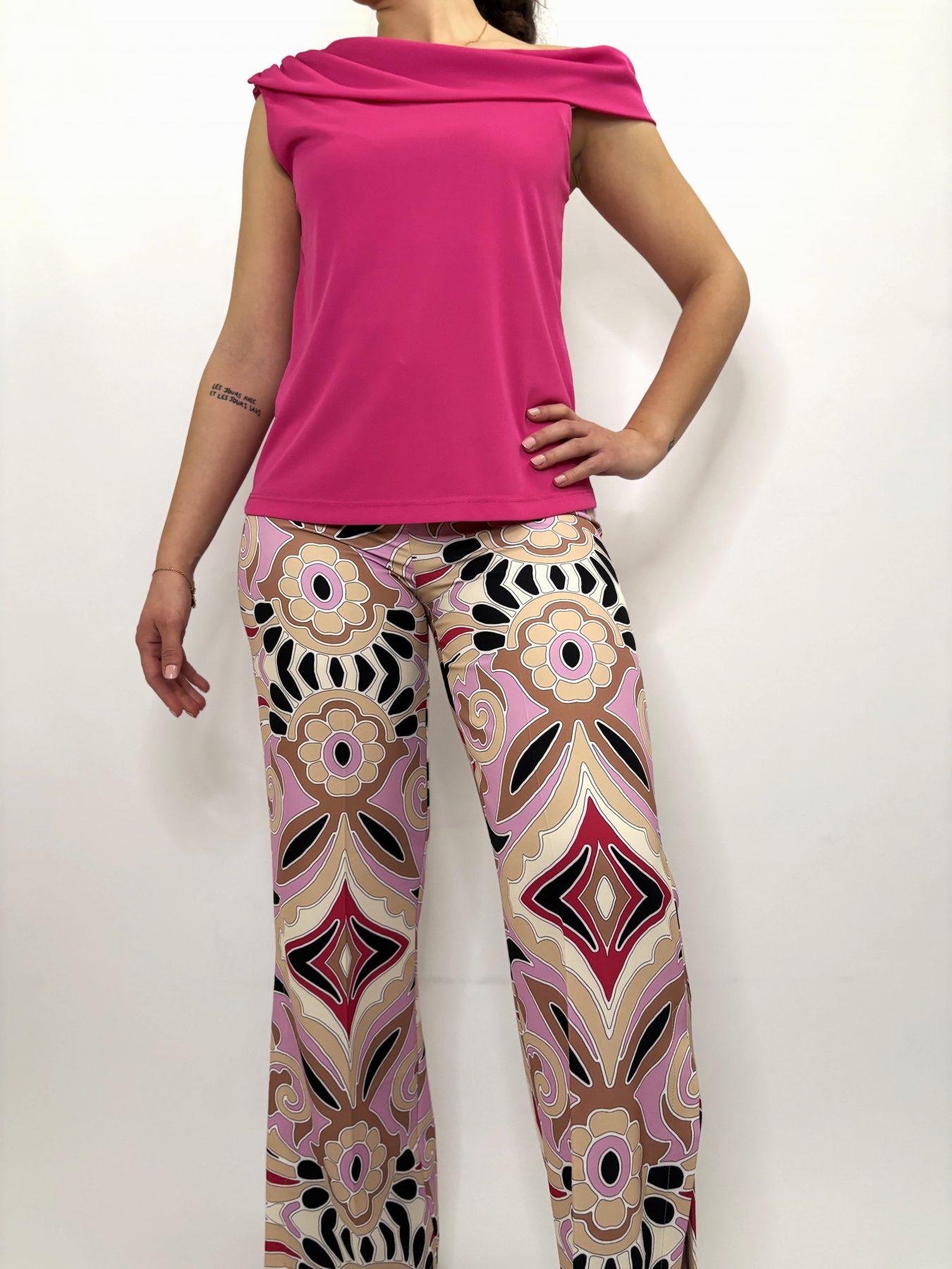 Femminile e vibrante, questo top fucsia è perfetto per dare un tocco di colore al tuo look. Il raffinato scollo a barca valorizza spalle e décolleté con eleganza, mentre il taglio essenziale lo rende facile da abbinare a pantaloni, gonne o jeans. Realizzato in tessuto leggero e confortevole, è ideale per le giornate estive o per un’occasione speciale in cui vuoi brillare.