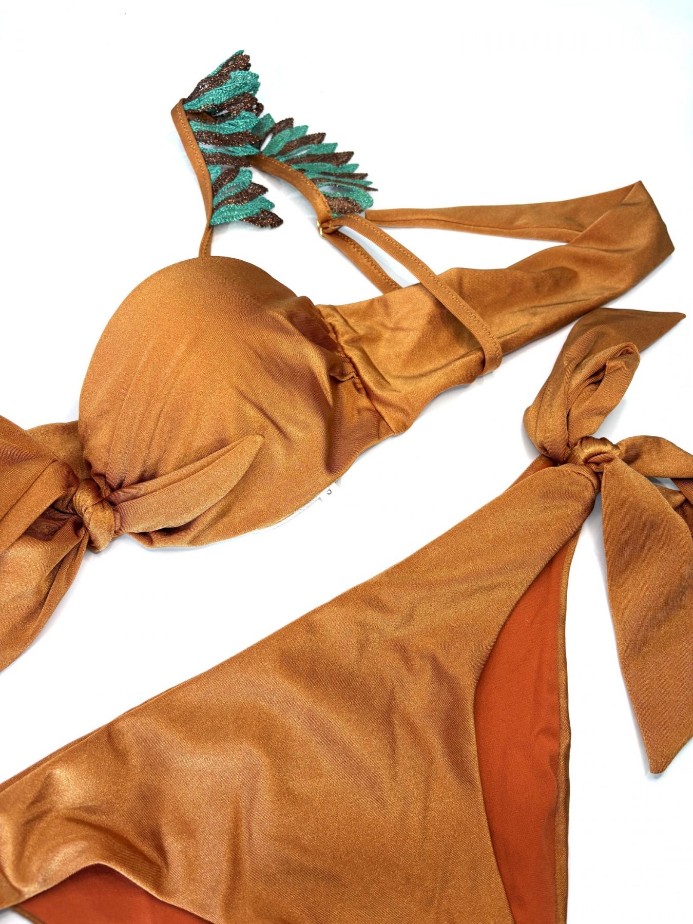Una combinazione cromatica calda e originale, per un look estivo che non passa inosservato. Ideale per chi cerca un costume pratico ma ricco di stile e dettagli ricercati.