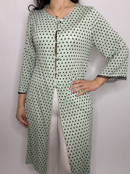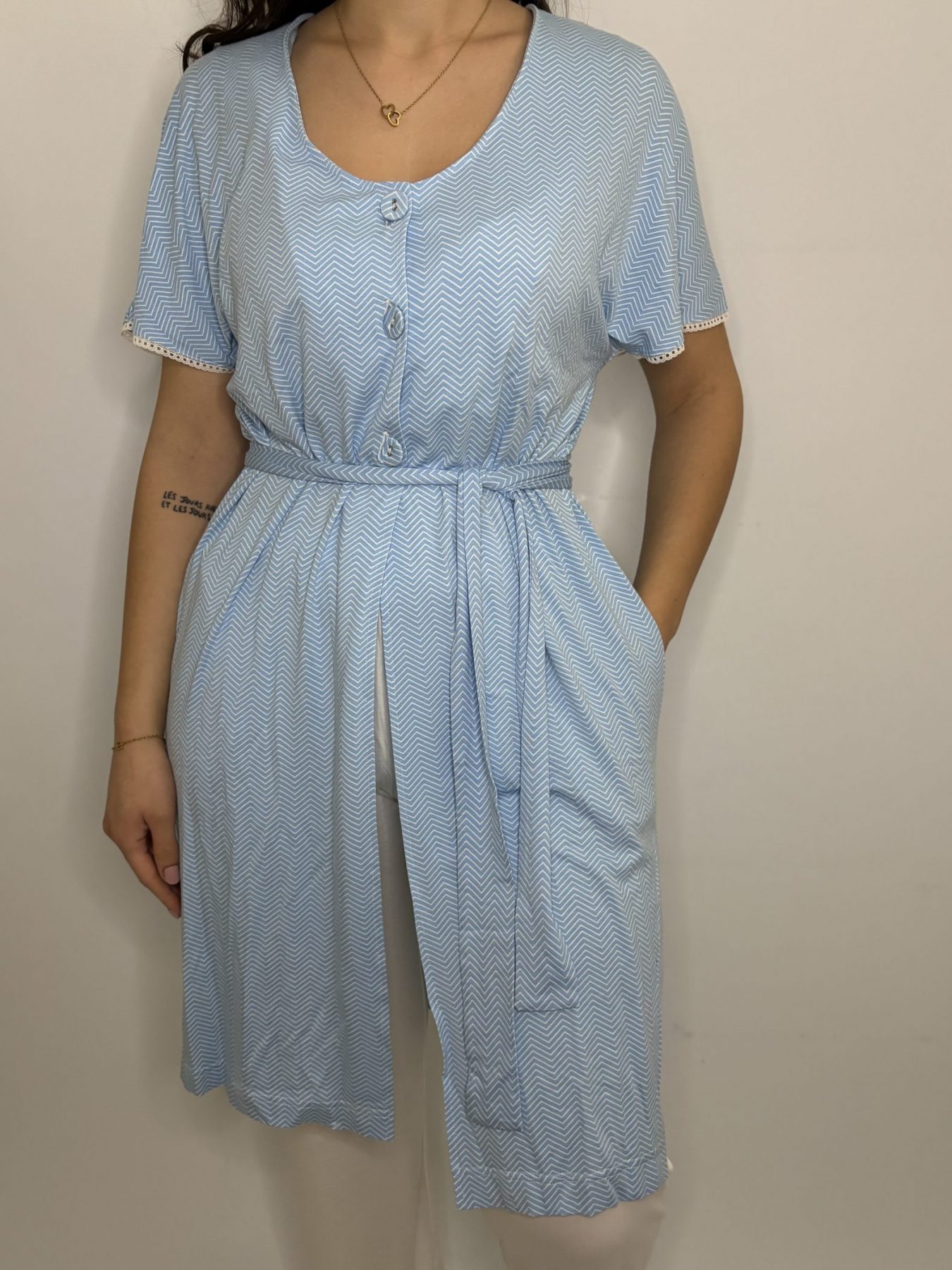 Caratterizzata da una comoda mezza manica, presenta una mezza abbottonatura frontale che conferisce un tocco classico e discreto. La fusciacca in vita valorizza la silhouette con naturalezza, regalando una vestibilità regolabile e confortevole. Leggera e piacevole sulla pelle, è ideale da indossare al mattino o alla sera, per sentirsi subito in ordine e avvolta da una sensazione di benessere.