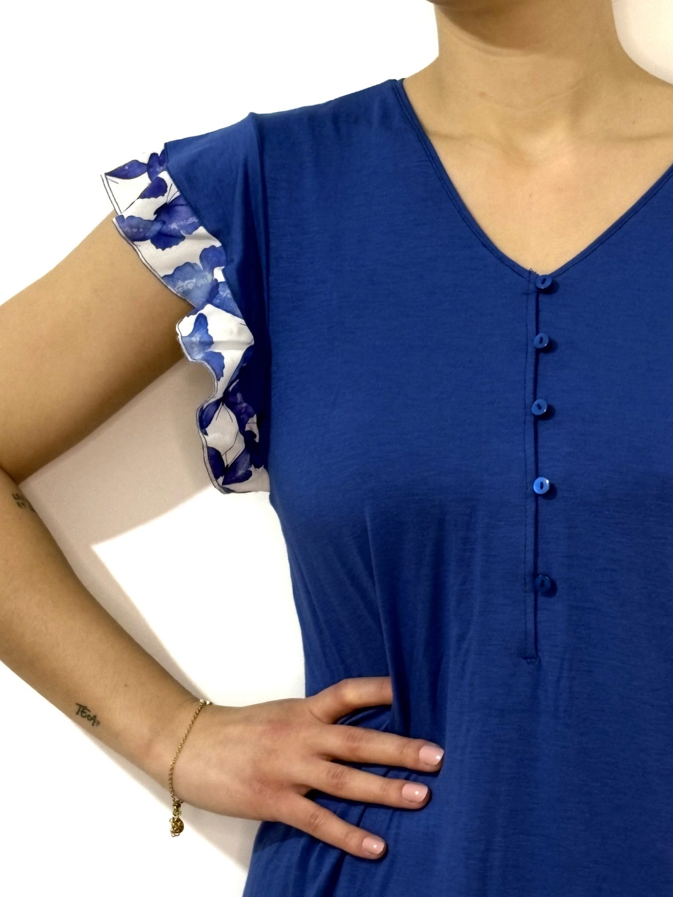 Il vero punto di forza di questa camicia da notte è il dettaglio in tessuto bianco con una delicata fantasia di farfalle, che impreziosisce l’orlo della mezza manica e la base della camicia. Questa decorazione dona un tocco di eleganza senza rinunciare alla dolcezza e alla leggerezza. La combinazione del bluette con il bianco crea un contrasto armonioso, che rende questo capo unico e raffinato.