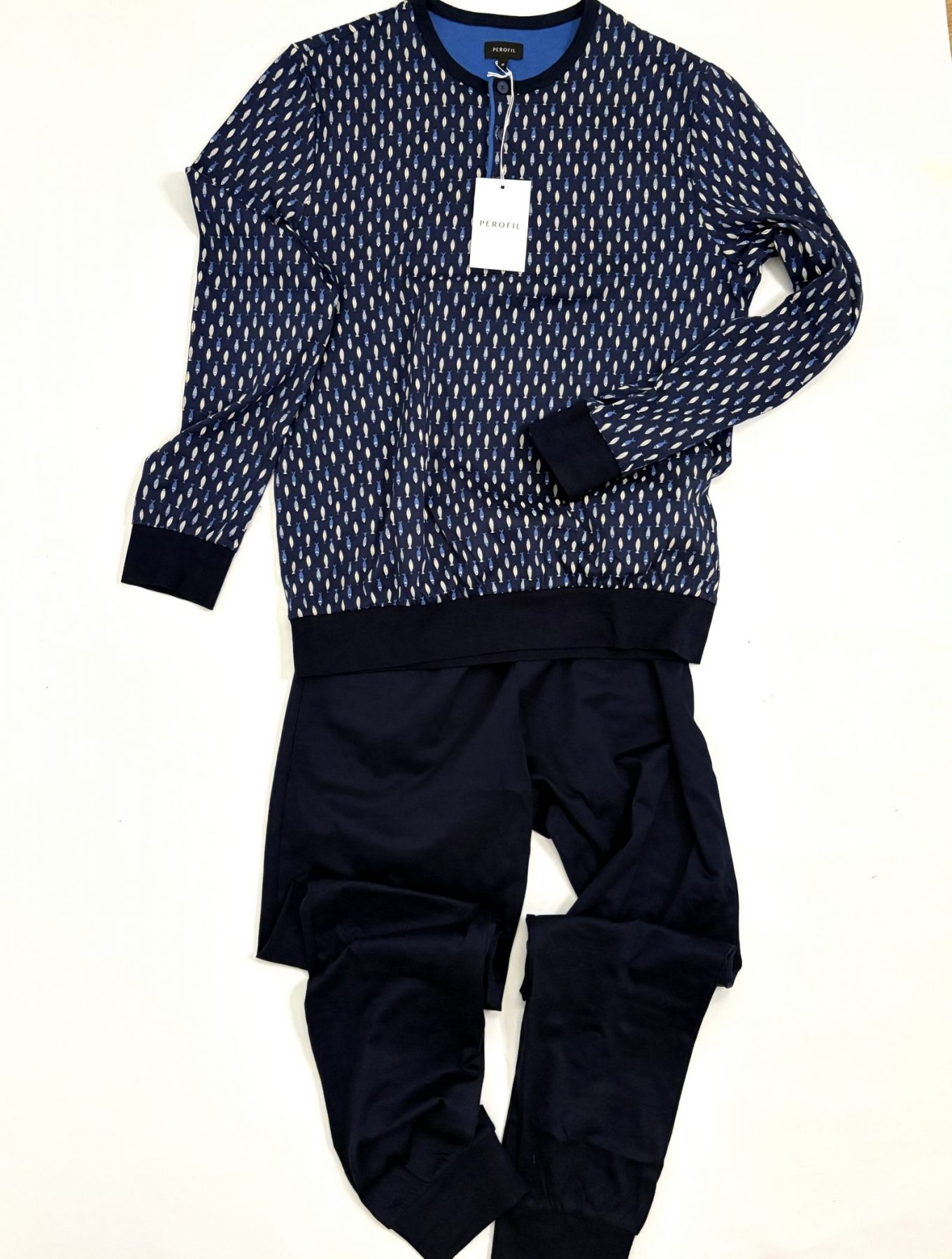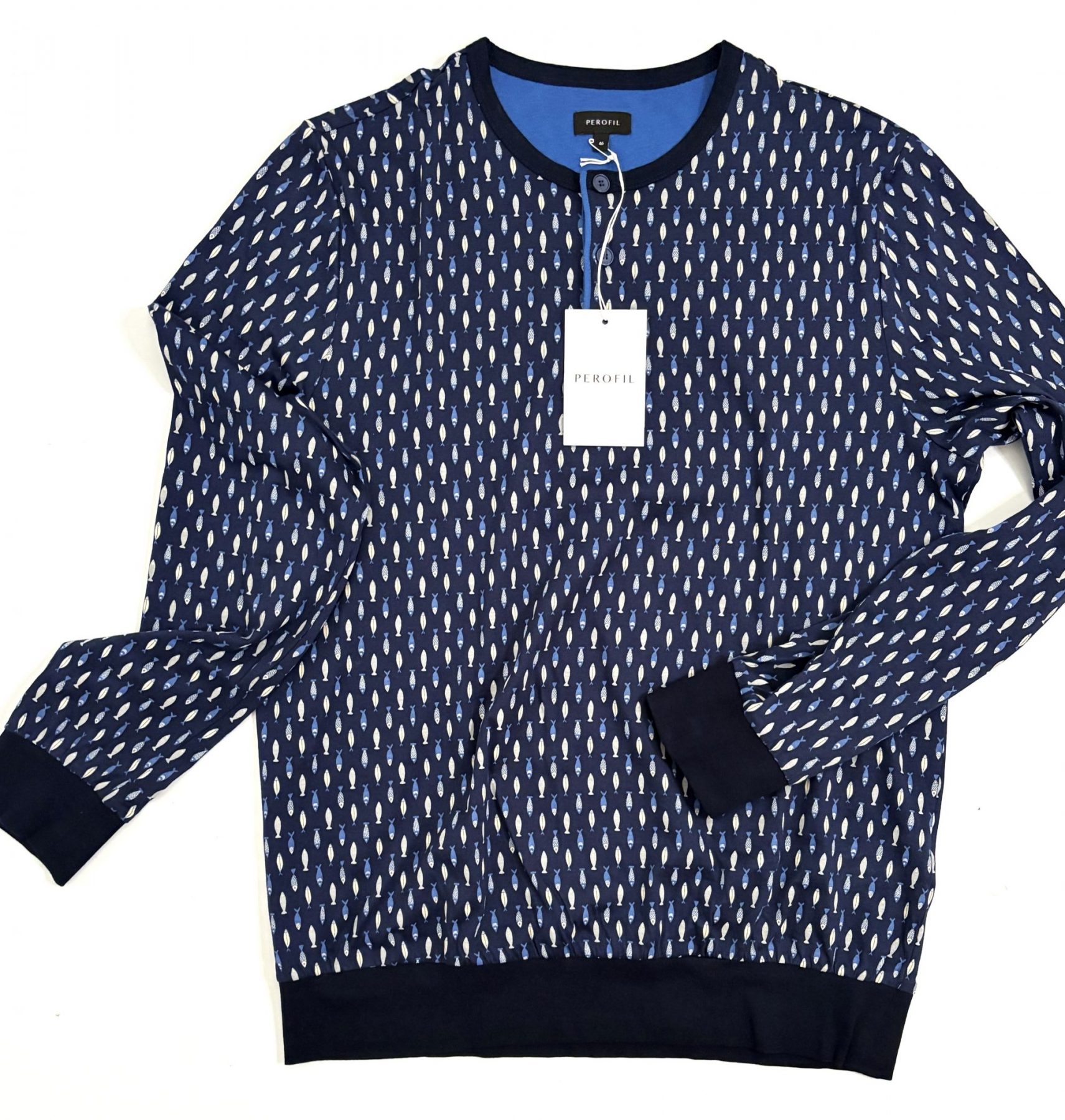 Questo pigiama della linea Perofil unisce comfort e stile con una maglia a manica lunga dal fondo blu, arricchita da una vivace fantasia di pesciolini colorati. Lo scollo serafino e i polsini su maniche e base garantiscono una vestibilità comoda e curata nei dettagli.
