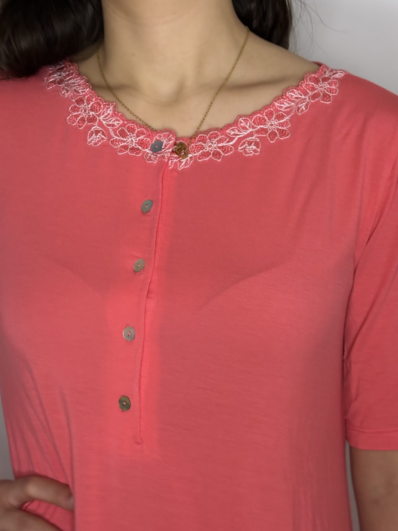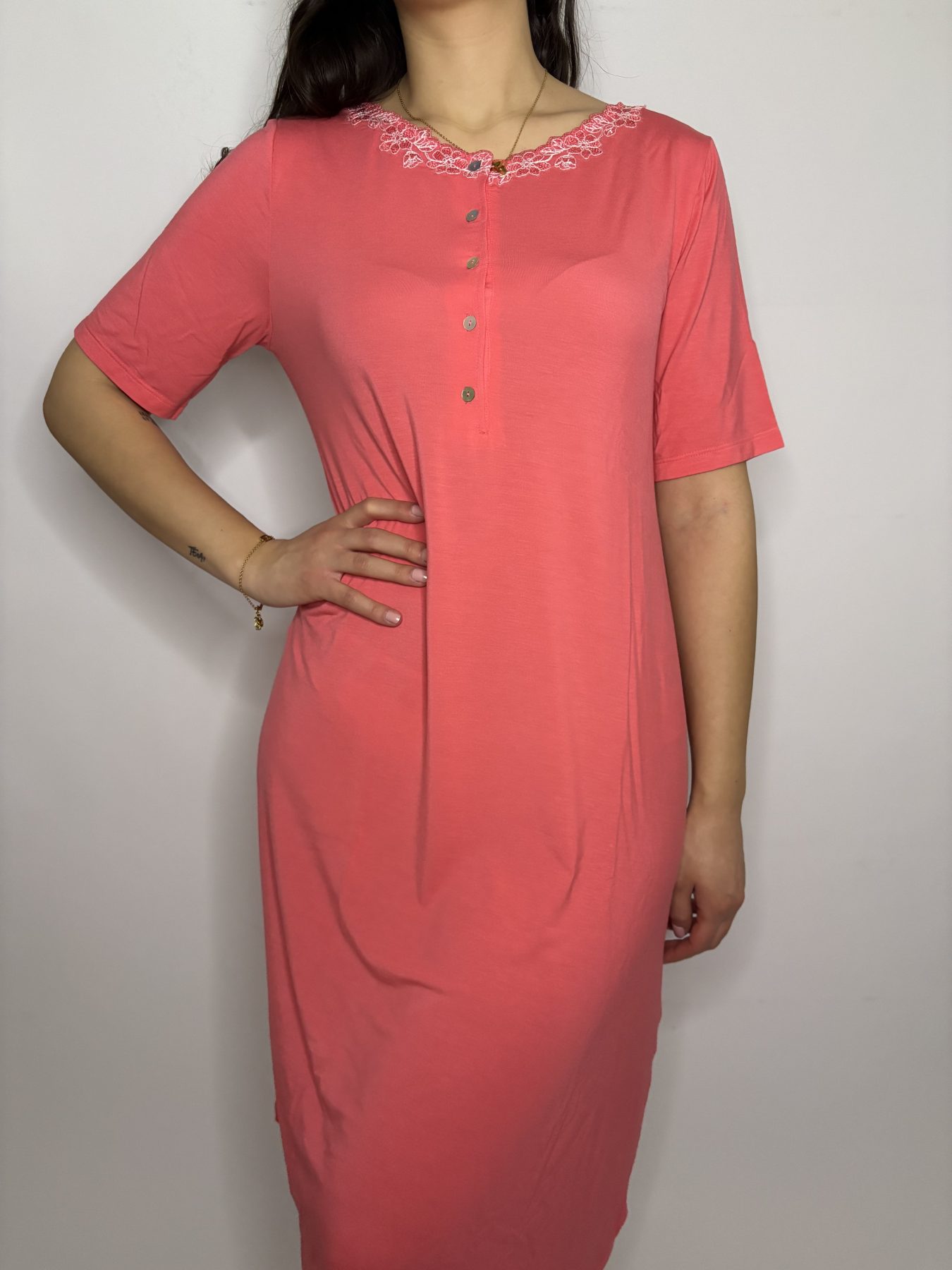 Realizzata in tessuti morbidi e confortevoli, questa camicia da notte è perfetta per le notti più calde, offrendo comfort senza rinunciare allo stile. Il colore corallo vivace illumina il tuo guardaroba da notte, mentre il pizzo arricchisce il capo con un tocco di classe.