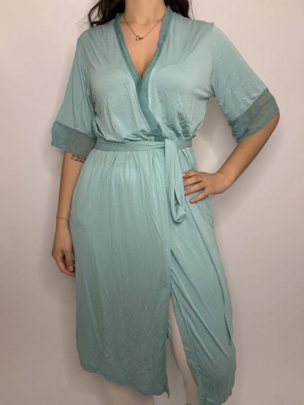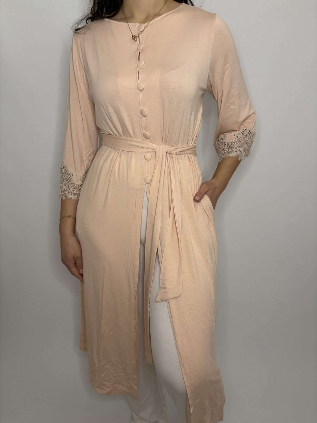 Il modello presenta un’abbottonatura a metà, con bottoni ricoperti dello stesso tessuto per un effetto armonioso e raffinato. La fusciacca in vita permette di regolare la vestibilità, avvolgendo dolcemente la silhouette e valorizzando la femminilità con garbo. Le maniche lunghe sono impreziosite da un meraviglioso inserto in pizzo, leggero e delicatissimo, che completa il capo con un tocco di eleganza senza tempo.